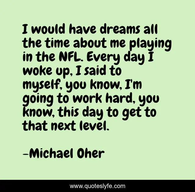 This page presents the quote "I would have dreams all the time about me playing in the NFL. Every day I woke up, I said to myself, you know, I'm going to work hard, you know, this day to get to that next level.". Author of this quote is Michael Oher. This quote is about myself, work, time,.