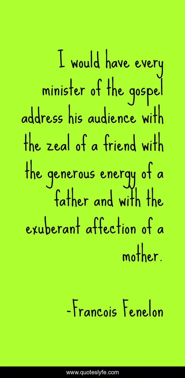 This page presents the quote "I would have every minister of the gospel address his audience with the zeal of a friend with the generous energy of a father and with the exuberant affection of a mother.". Author of this quote is Francois Fenelon. .