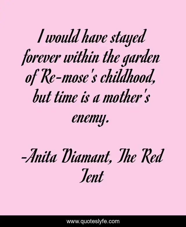 This page presents the quote "I would have stayed forever within the garden of Re-mose's childhood, but time is a mother's enemy.". Author of this quote is Anita Diamant, The Red Tent. This quote is about youth, parenting, growing-up, innocence-lost,.