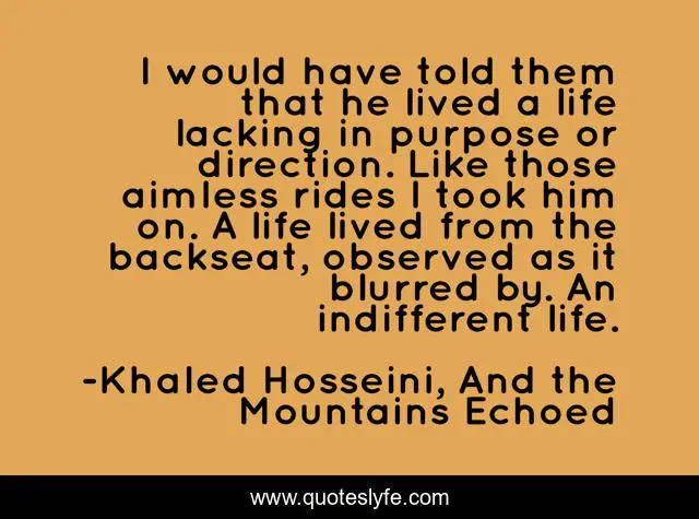 This page presents the quote "I would have told them that he lived a life lacking in purpose or direction. Like those aimless rides I took him on. A life lived from the backseat, observed as it blurred by. An indifferent life.". Author of this quote is Khaled Hosseini, And the Mountains Echoed. This quote is about life-and-living, life-purpose,.