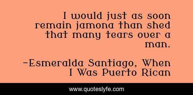 This page presents the quote "I would just as soon remain jamona than shed that many tears over a man.". Author of this quote is Esmeralda Santiago, When I Was Puerto Rican. This quote is about tears, men, women-and-men, women,.