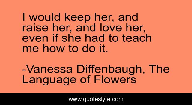 This page presents the quote "I would keep her, and raise her, and love her, even if she had to teach me how to do it.". Author of this quote is Vanessa Diffenbaugh, The Language of Flowers. This quote is about vanessa-diffenbaugh, part-3, page-280, motherhood, the-language-of-flowers, victoria-jones, chapter-7,.