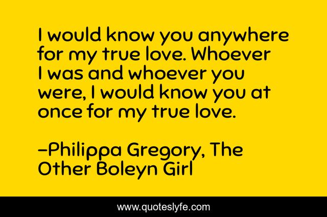 This page presents the quote "I would know you anywhere for my true love. Whoever I was and whoever you were, I would know you at once for my true love.". Author of this quote is Philippa Gregory, The Other Boleyn Girl. This quote is about romance, love, affection,.