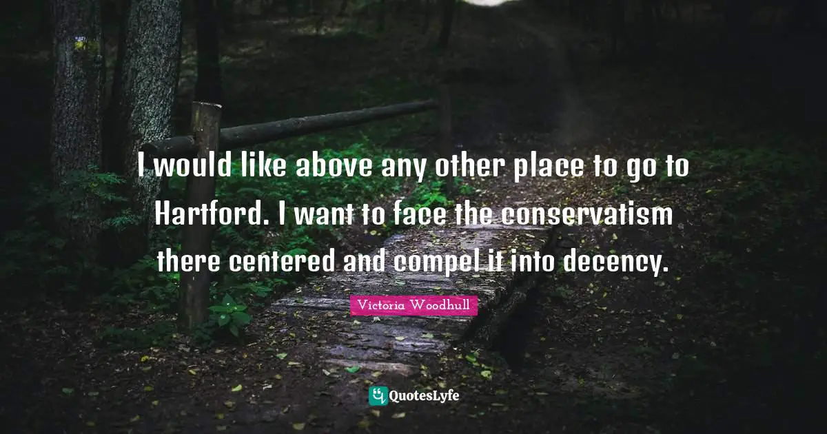 This page presents the quote "I would like above any other place to go to Hartford. I want to face the conservatism there centered and compel it into decency.". Author of this quote is Victoria Woodhull. This quote is about conservatism, places to go, decency, faces,.