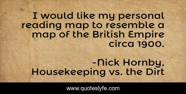 This page presents the quote "I would like my personal reading map to resemble a map of the British Empire circa 1900.". Author of this quote is Nick Hornby, Housekeeping vs. the Dirt. This quote is about books, reading,.