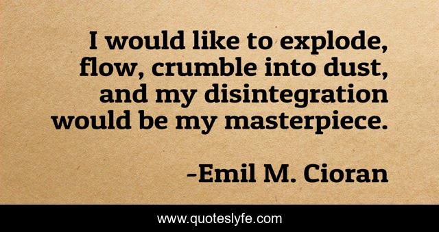 This page presents the quote "I would like to explode, flow, crumble into dust, and my disintegration would be my masterpiece.". Author of this quote is Emil M. Cioran. .