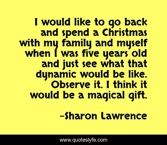 This page presents the quote "I would like to go back and spend a Christmas with my family and myself when I was five years old and just see what that dynamic would be like. Observe it. I think it would be a magical gift.". Author of this quote is Sharon Lawrence. This quote is about myself, family, gift,.