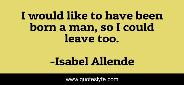 This page presents the quote "I would like to have been born a man, so I could leave too.". Author of this quote is Isabel Allende. .