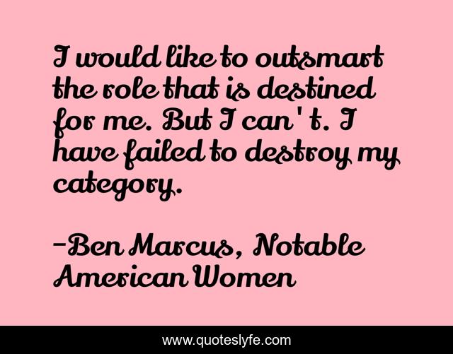 This page presents the quote "I would like to outsmart the role that is destined for me. But I can't. I have failed to destroy my category.". Author of this quote is Ben Marcus, Notable American Women. This quote is about destiny, roles, labels, fate, names, categories,.