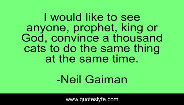 This page presents the quote "I would like to see anyone, prophet, king or God, convince a thousand cats to do the same thing at the same time.". Author of this quote is Neil Gaiman. This quote is about cooperation, chaos, willfullness, cats, pets, organization, persuasion,.