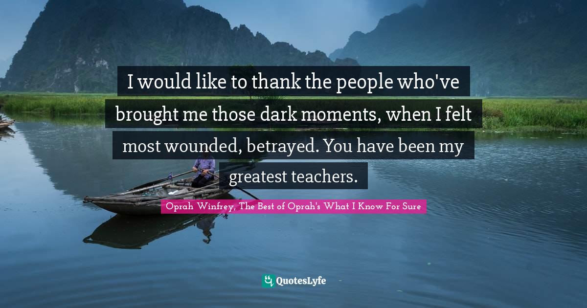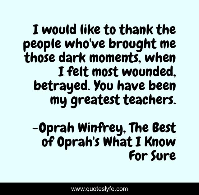 This page presents the quote "I would like to thank the people who've brought me those dark moments, when I felt most wounded, betrayed. You have been my greatest teachers.". Author of this quote is Oprah Winfrey, The Best of Oprah's What I Know For Sure. This quote is about perseverance, darkness,.