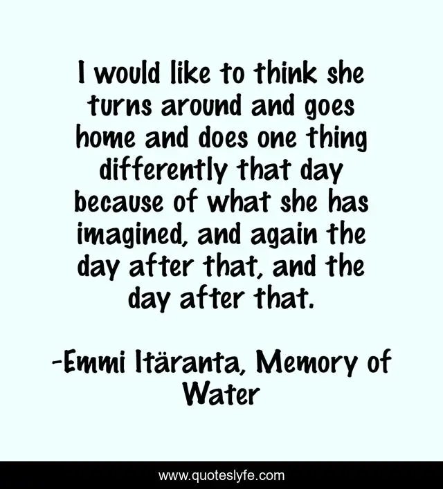 This page presents the quote "I would like to think she turns around and goes home and does one thing differently that day because of what she has imagined, and again the day after that, and the day after that.". Author of this quote is Emmi Itäranta, Memory of Water. This quote is about past, future, present, imagine,.