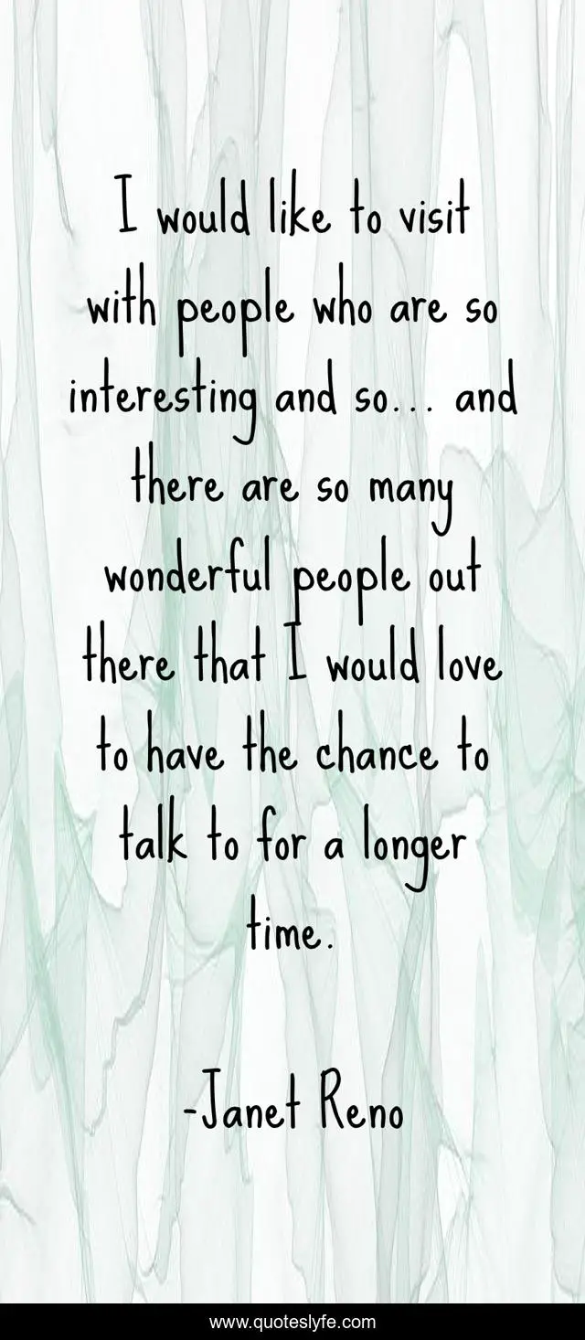 This page presents the quote "I would like to visit with people who are so interesting and so... and there are so many wonderful people out there that I would love to have the chance to talk to for a longer time.". Author of this quote is Janet Reno. This quote is about time, love, affection, people,.