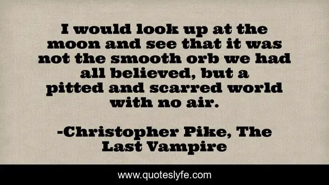 This page presents the quote "I would look up at the moon and see that it was not the smooth orb we had all believed, but a pitted and scarred world with no air.". Author of this quote is Christopher Pike, The Last Vampire. This quote is about sita, alisa-perne, disillusionment, reality,.
