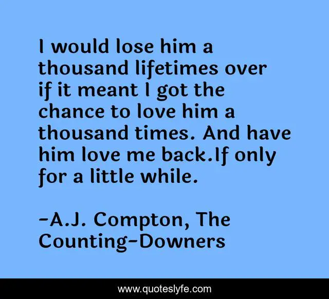 This page presents the quote "I would lose him a thousand lifetimes over if it meant I got the chance to love him a thousand times. And have him love me back.If only for a little while.". Author of this quote is A.J. Compton, The Counting-Downers. This quote is about loss, life, love, destiny, soulmates, romance, affection,.