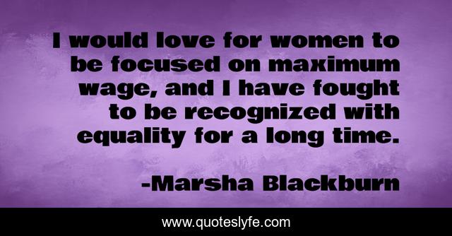 This page presents the quote "I would love for women to be focused on maximum wage, and I have fought to be recognized with equality for a long time.". Author of this quote is Marsha Blackburn. This quote is about time, love, affection, women,.