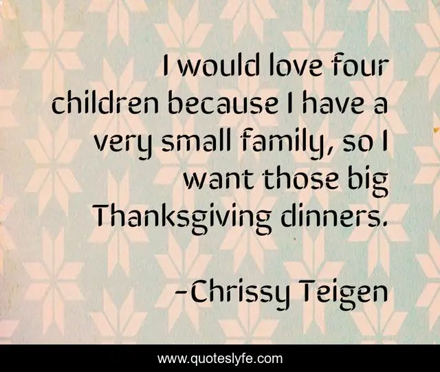 This page presents the quote "I would love four children because I have a very small family, so I want those big Thanksgiving dinners.". Author of this quote is Chrissy Teigen. This quote is about family, love, children, affection,.