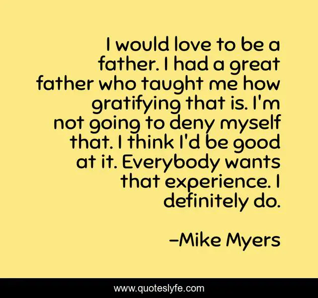 This page presents the quote "I would love to be a father. I had a great father who taught me how gratifying that is. I'm not going to deny myself that. I think I'd be good at it. Everybody wants that experience. I definitely do.". Author of this quote is Mike Myers. This quote is about love, good, father, affection,.