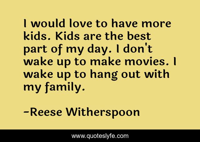 This page presents the quote "I would love to have more kids. Kids are the best part of my day. I don't wake up to make movies. I wake up to hang out with my family.". Author of this quote is Reese Witherspoon. This quote is about family, love, best, affection,.