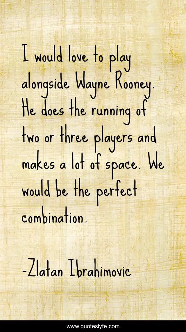 This page presents the quote "I would love to play alongside Wayne Rooney. He does the running of two or three players and makes a lot of space. We would be the perfect combination.". Author of this quote is Zlatan Ibrahimovic. This quote is about perfect, play, love, affection,.