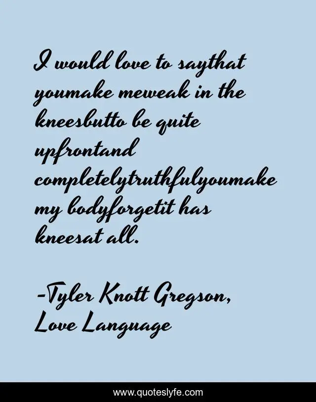 This page presents the quote "I would love to saythat youmake meweak in the kneesbutto be quite upfrontand completelytruthfulyoumake my bodyforgetit has kneesat all.". Author of this quote is Tyler Knott Gregson, Love Language. This quote is about love, poetry, affection,.