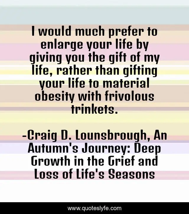 This page presents the quote "I would much prefer to enlarge your life by giving you the gift of my life, rather than gifting your life to material obesity with frivolous trinkets.". Author of this quote is Craig D. Lounsbrough, An Autumn's Journey: Deep Growth in the Grief and Loss of Life's Seasons. This quote is about trinkets, life, gift, giving, gifting, gifts, obesity, christmas, frivolous,.
