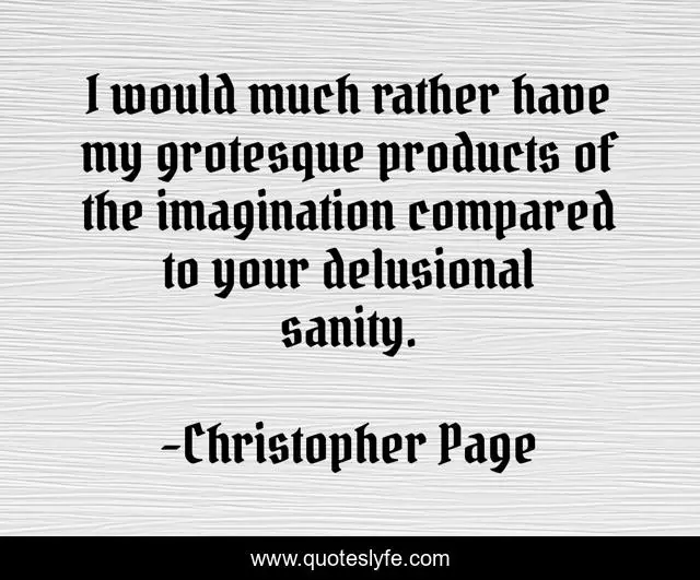 This page presents the quote "I would much rather have my grotesque products of the imagination compared to your delusional sanity.". Author of this quote is Christopher Page. This quote is about insane, sanity, mental-health, psychology, insanity,.