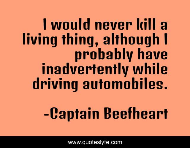 This page presents the quote "I would never kill a living thing, although I probably have inadvertently while driving automobiles.". Author of this quote is Captain Beefheart. This quote is about living, driving,.