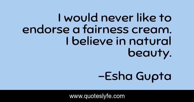 This page presents the quote "I would never like to endorse a fairness cream. I believe in natural beauty.". Author of this quote is Esha Gupta. This quote is about i believe, believe,.
