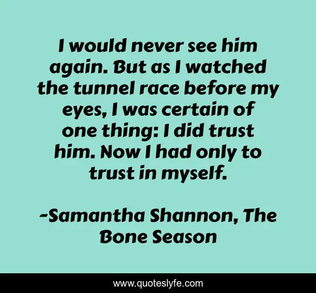 This page presents the quote "I would never see him again. But as I watched the tunnel race before my eyes, I was certain of one thing: I did trust him. Now I had only to trust in myself.". Author of this quote is Samantha Shannon, The Bone Season. This quote is about samantha-shannon, scion, paige-mahoney, sheol-i, scion-london, trust, the-bone-season,.