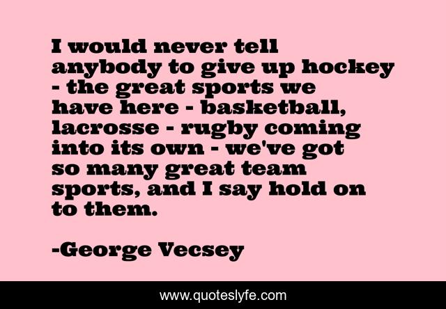 This page presents the quote "I would never tell anybody to give up hockey - the great sports we have here - basketball, lacrosse - rugby coming into its own - we've got so many great team sports, and I say hold on to them.". Author of this quote is George Vecsey. This quote is about great, hockey, team,.