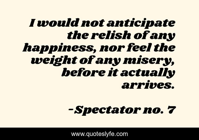 This page presents the quote "I would not anticipate the relish of any happiness, nor feel the weight of any misery, before it actually arrives.". Author of this quote is Spectator no. 7. This quote is about anticipation, happiness, worry, misery,.