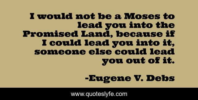 This page presents the quote "I would not be a Moses to lead you into the Promised Land, because if I could lead you into it, someone else could lead you out of it.". Author of this quote is Eugene V. Debs. This quote is about leadership, leaders,.