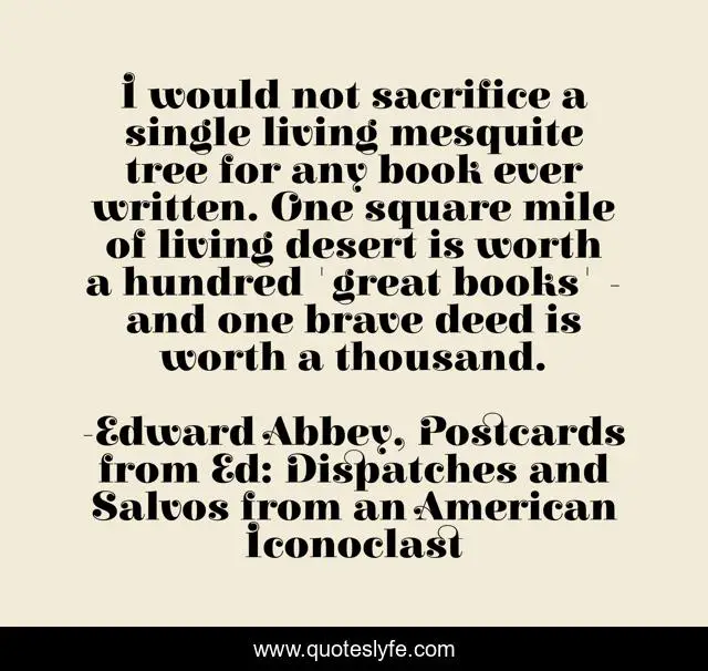 This page presents the quote "I would not sacrifice a single living mesquite tree for any book ever written. One square mile of living desert is worth a hundred 'great books' - and one brave deed is worth a thousand.". Author of this quote is Edward Abbey, Postcards from Ed: Dispatches and Salvos from an American Iconoclast. This quote is about sacrifice, books, desert, bravery,.