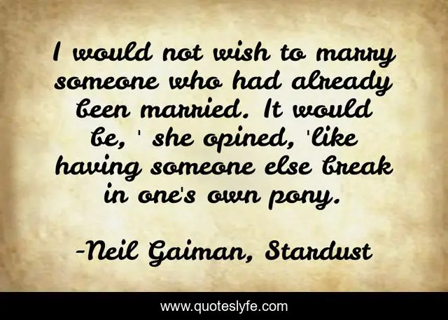 This page presents the quote "I would not wish to marry someone who had already been married. It would be, ' she opined, 'like having someone else break in one's own pony.". Author of this quote is Neil Gaiman, Stardust. This quote is about immaturity, humor, marriage,.