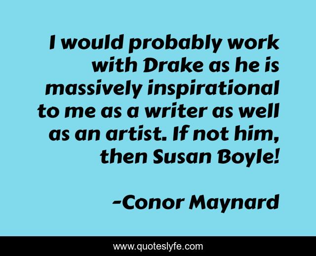 This page presents the quote "I would probably work with Drake as he is massively inspirational to me as a writer as well as an artist. If not him, then Susan Boyle!". Author of this quote is Conor Maynard. This quote is about me, work, artist,.