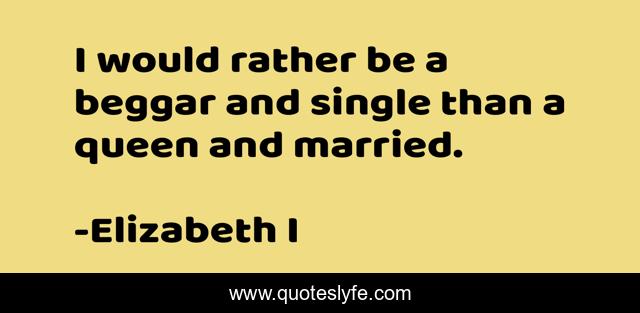 This page presents the quote "I would rather be a beggar and single than a queen and married.". Author of this quote is Elizabeth I. This quote is about single, queen, married,.
