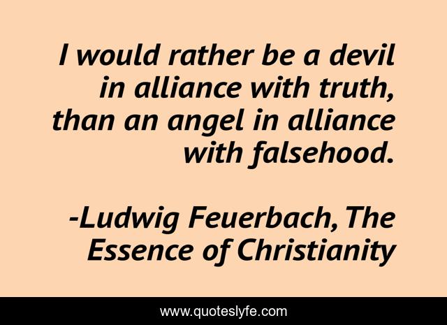 This page presents the quote "I would rather be a devil in alliance with truth, than an angel in alliance with falsehood.". Author of this quote is Ludwig Feuerbach, The Essence of Christianity. This quote is about falsehood, devil, inspirational, angel, character, truth, enthusiasm,.