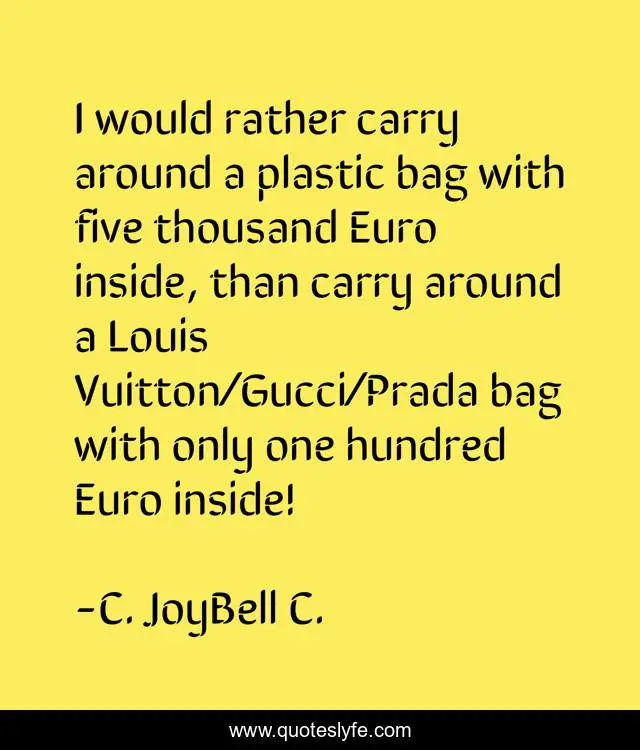 This page presents the quote "I would rather carry around a plastic bag with five thousand Euro inside, than carry around a Louis Vuitton/Gucci/Prada bag with only one hundred Euro inside!". Author of this quote is C. JoyBell C.. This quote is about living, life, fashion, money, women-and-fashion, wisdom, common-sense,.