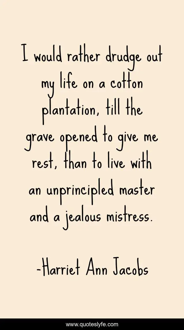 This page presents the quote "I would rather drudge out my life on a cotton plantation, till the grave opened to give me rest, than to live with an unprincipled master and a jealous mistress.". Author of this quote is Harriet Ann Jacobs. This quote is about me, life, live,.