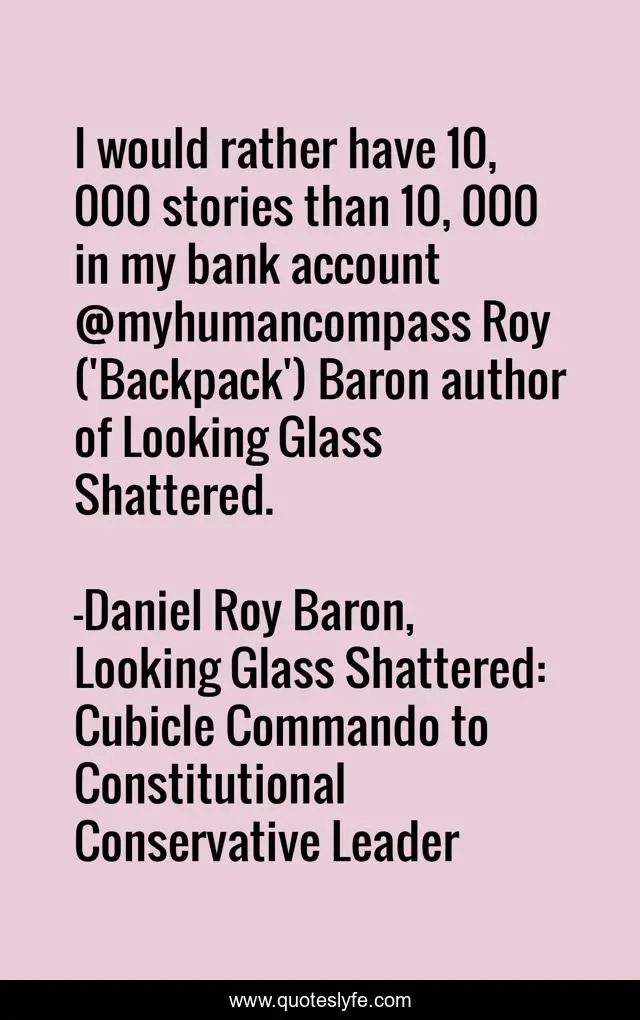 This page presents the quote "I would rather have 10, 000 stories than 10, 000 in my bank account @myhumancompass Roy ('Backpack') Baron author of Looking Glass Shattered.". Author of this quote is Daniel Roy Baron, Looking Glass Shattered: Cubicle Commando to Constitutional Conservative Leader. This quote is about freedom, travel, true-story, memoir, adventure, politics-of-the-united-states, intrigue, commando,.