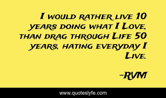 This page presents the quote "I would rather live 10 years doing what I Love, than drag through Life 50 years, hating everyday I Live.". Author of this quote is RVM. This quote is about motivation, inspiration,.