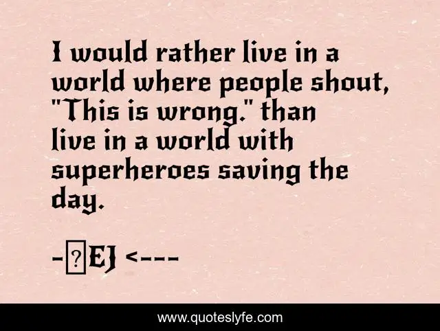 This page presents the quote "I would rather live in a world where people shout, "This is wrong." than live in a world with superheroes saving the day.". Author of this quote is ♥EJ <---. This quote is about enthusiasm, inspirational,.