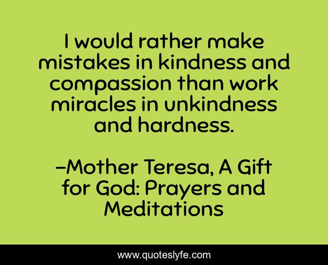 This page presents the quote "I would rather make mistakes in kindness and compassion than work miracles in unkindness and hardness.". Author of this quote is Mother Teresa, A Gift for God: Prayers and Meditations. This quote is about compassion, enthusiasm, kindness, christian-values, inspirational,.