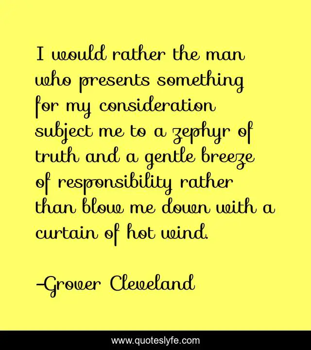 This page presents the quote "I would rather the man who presents something for my consideration subject me to a zephyr of truth and a gentle breeze of responsibility rather than blow me down with a curtain of hot wind.". Author of this quote is Grover Cleveland. This quote is about me, responsibility, man,.