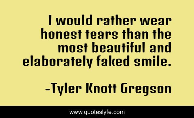 This page presents the quote "I would rather wear honest tears than the most beautiful and elaborately faked smile.". Author of this quote is Tyler Knott Gregson. This quote is about real, smile, tears, happiness, fake,.