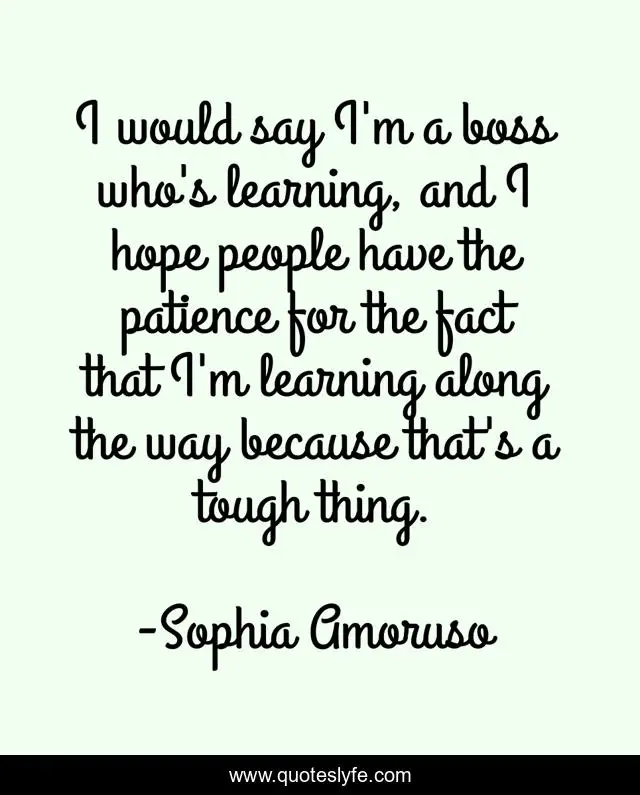 This page presents the quote "I would say I'm a boss who's learning, and I hope people have the patience for the fact that I'm learning along the way because that's a tough thing.". Author of this quote is Sophia Amoruso. This quote is about hope, learning, boss,.