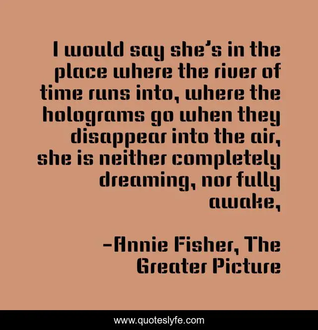 This page presents the quote "I would say she’s in the place where the river of time runs into, where the holograms go when they disappear into the air, she is neither completely dreaming, nor fully awake, ". Author of this quote is Annie Fisher, The Greater Picture. This quote is about coma, dreams, time,.