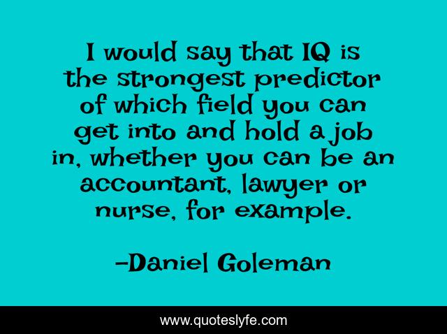 This page presents the quote "I would say that IQ is the strongest predictor of which field you can get into and hold a job in, whether you can be an accountant, lawyer or nurse, for example.". Author of this quote is Daniel Goleman. This quote is about job, lawyer,.