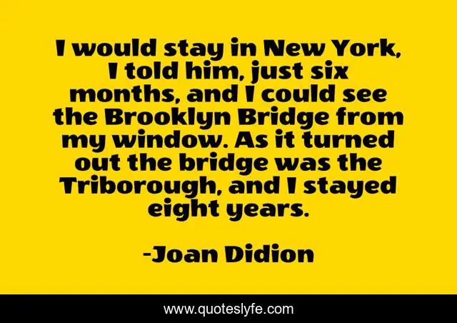 This page presents the quote "I would stay in New York, I told him, just six months, and I could see the Brooklyn Bridge from my window. As it turned out the bridge was the Triborough, and I stayed eight years.". Author of this quote is Joan Didion. .